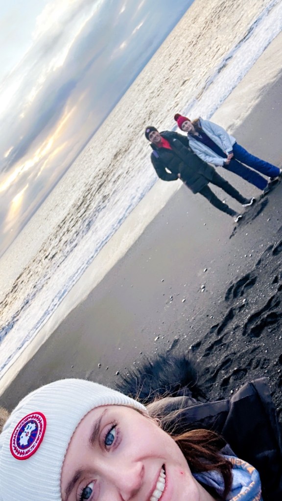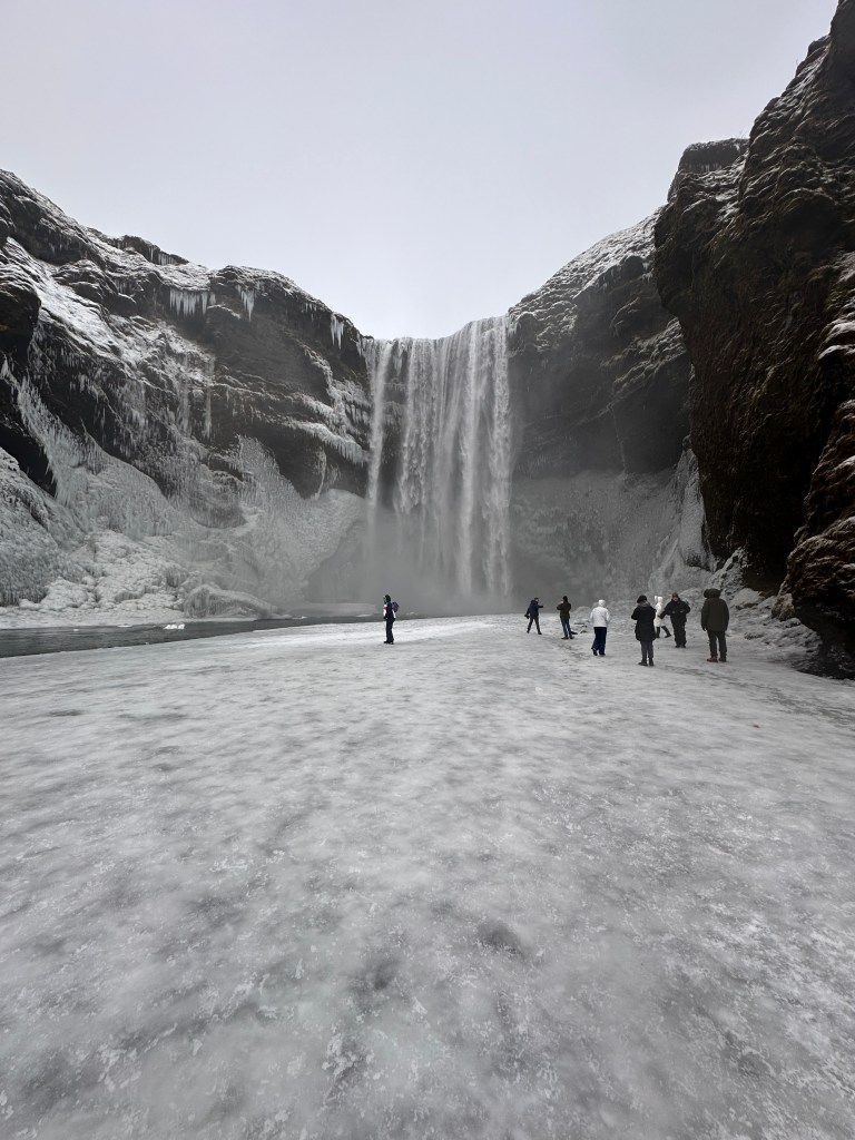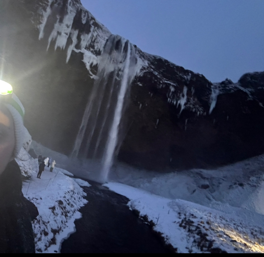 As we made our way back to the cabin, we stopped at two more incredible waterfalls, Seljalandsfoss and Kvernufoss & Skogafoss. Although we couldn’t walk behind Seljalandsfoss due to the icy conditions, we still managed to follow the trail into a little cavern that took us under the smaller waterfall. It was a surreal and magical experience.