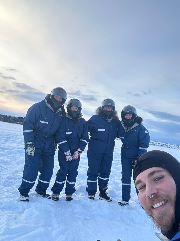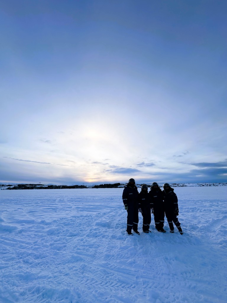 Next, we embarked on an adventure on quad bikes, which was an absolute blast! Our tour guide provided us with everything we needed, including snowsuits, helmets, and gloves. We rode along snowy landscapes and visited a frozen lake, where we took some fantastic photos. Our guide also shared with us the fascinating history of the British army’s equipment left behind in Iceland during World War II, which is still there today.