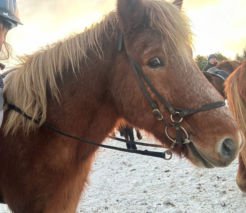 After packing up and tidying our lodge, we headed straight to Ishestar to meet our beautiful ponies. We watched an introductory video, got equipped with additional layers and helmets, and were asked about our level of experience before selecting our ponies. I was paired up with a pony called Patty, who, although primarily well-behaved, had a bit of a competitive streak at the start of the ride.